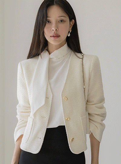 きらめく ノーカラー ゴールド ボタン ツイード ジャケット