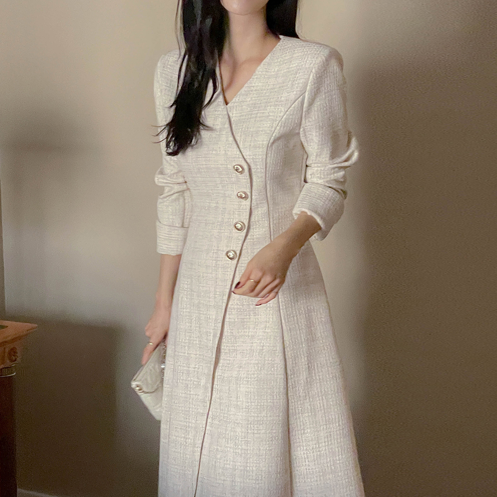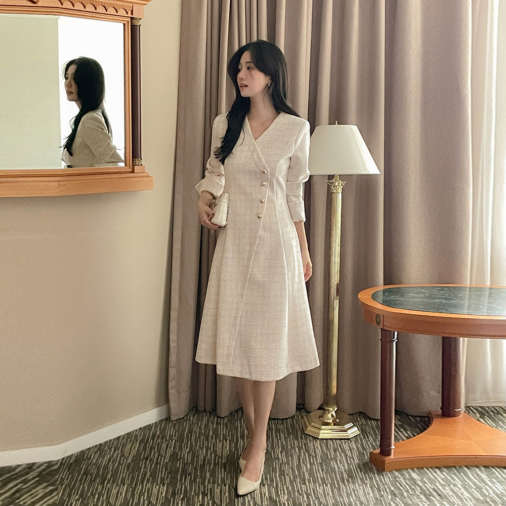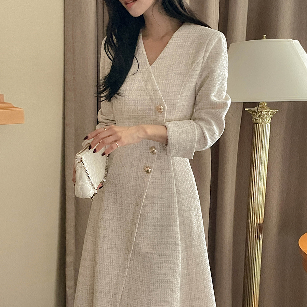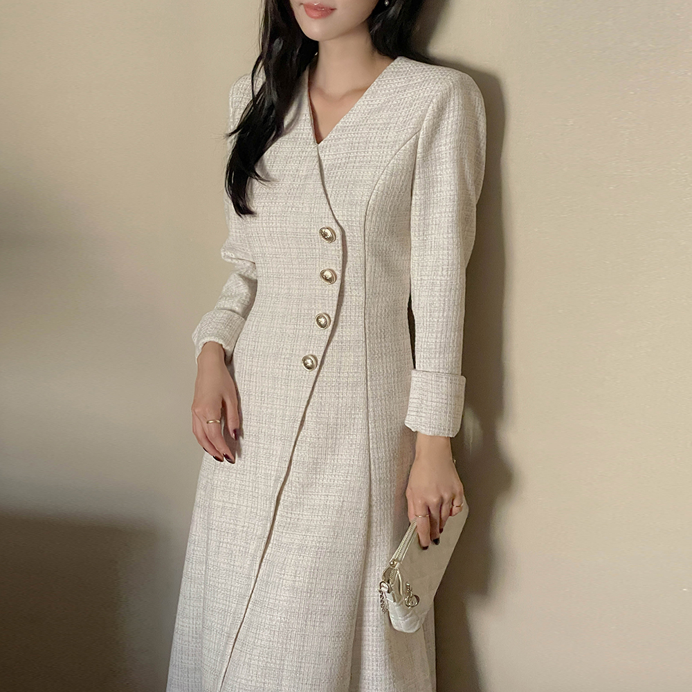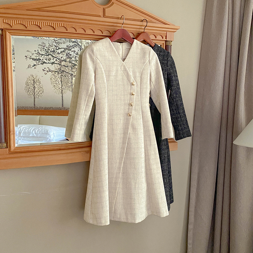 Merry 斜線 ボタン ツイード ロング Aライン ワンピース
