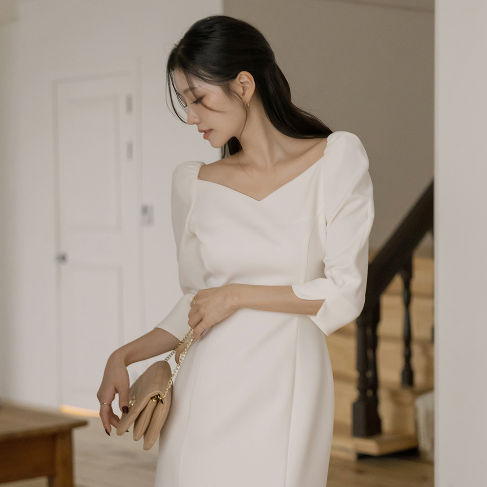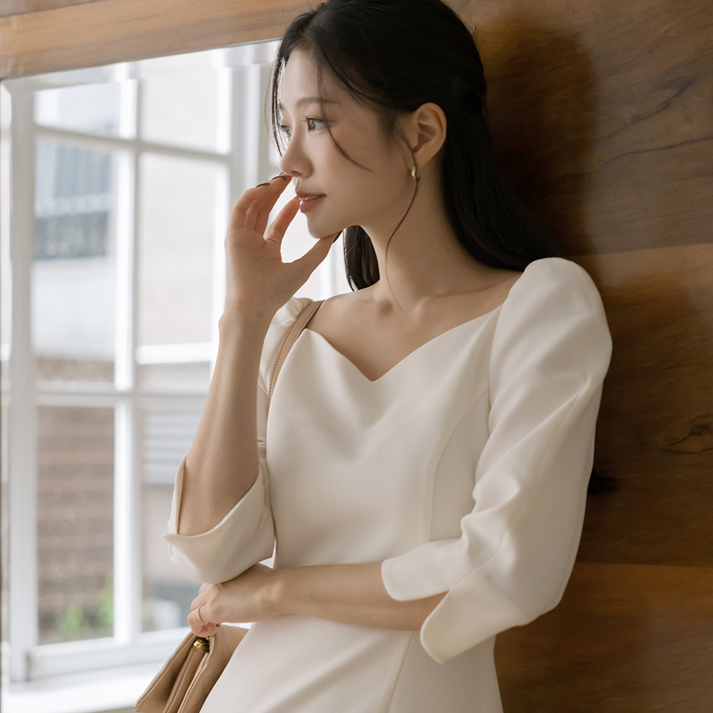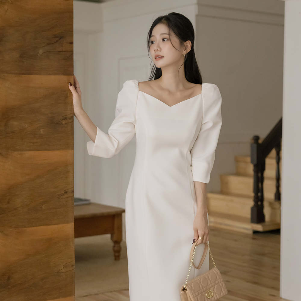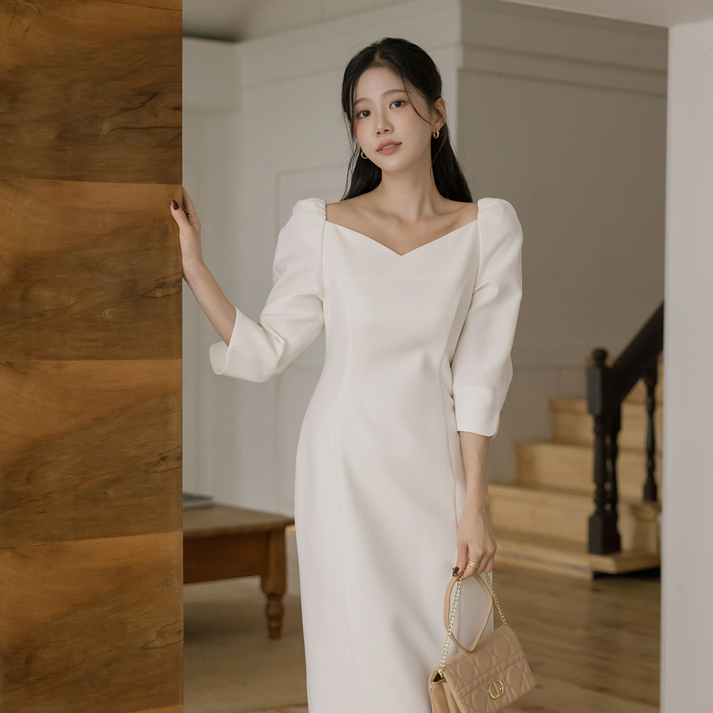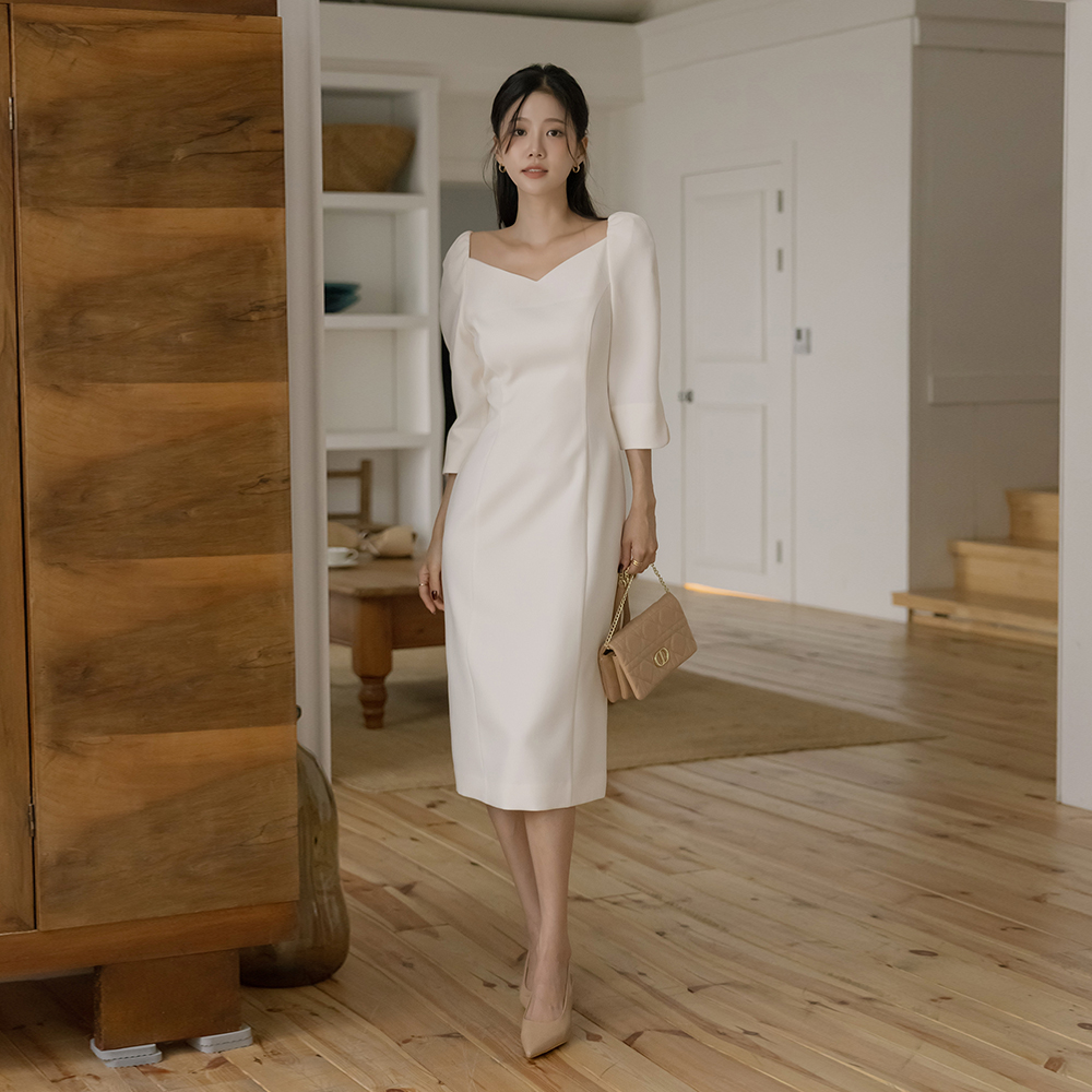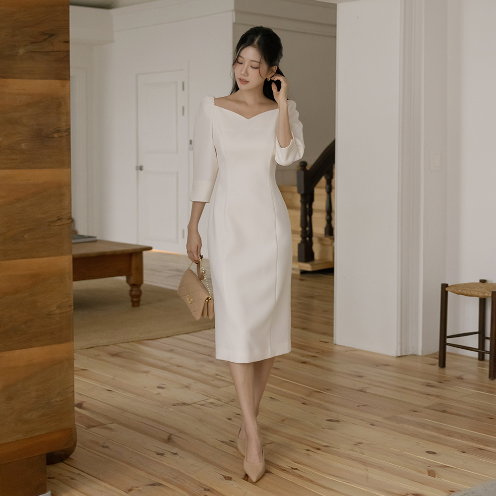 プレミアム ロマンチック ハートネック パフ スリム ワンピース