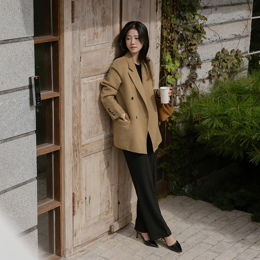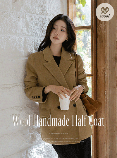 カラーネック ダブル ボタン ウール ハンドメード ハーフ コート
