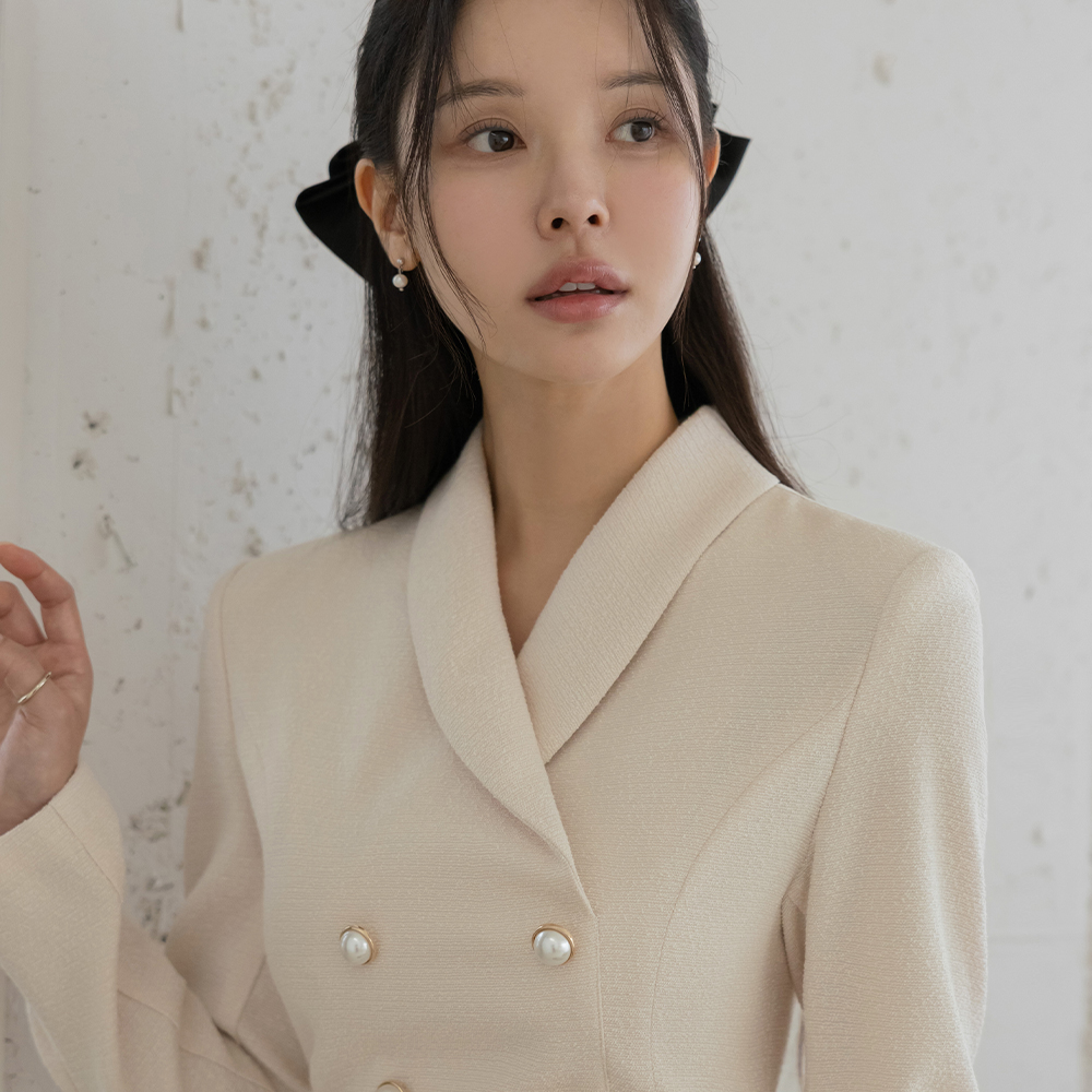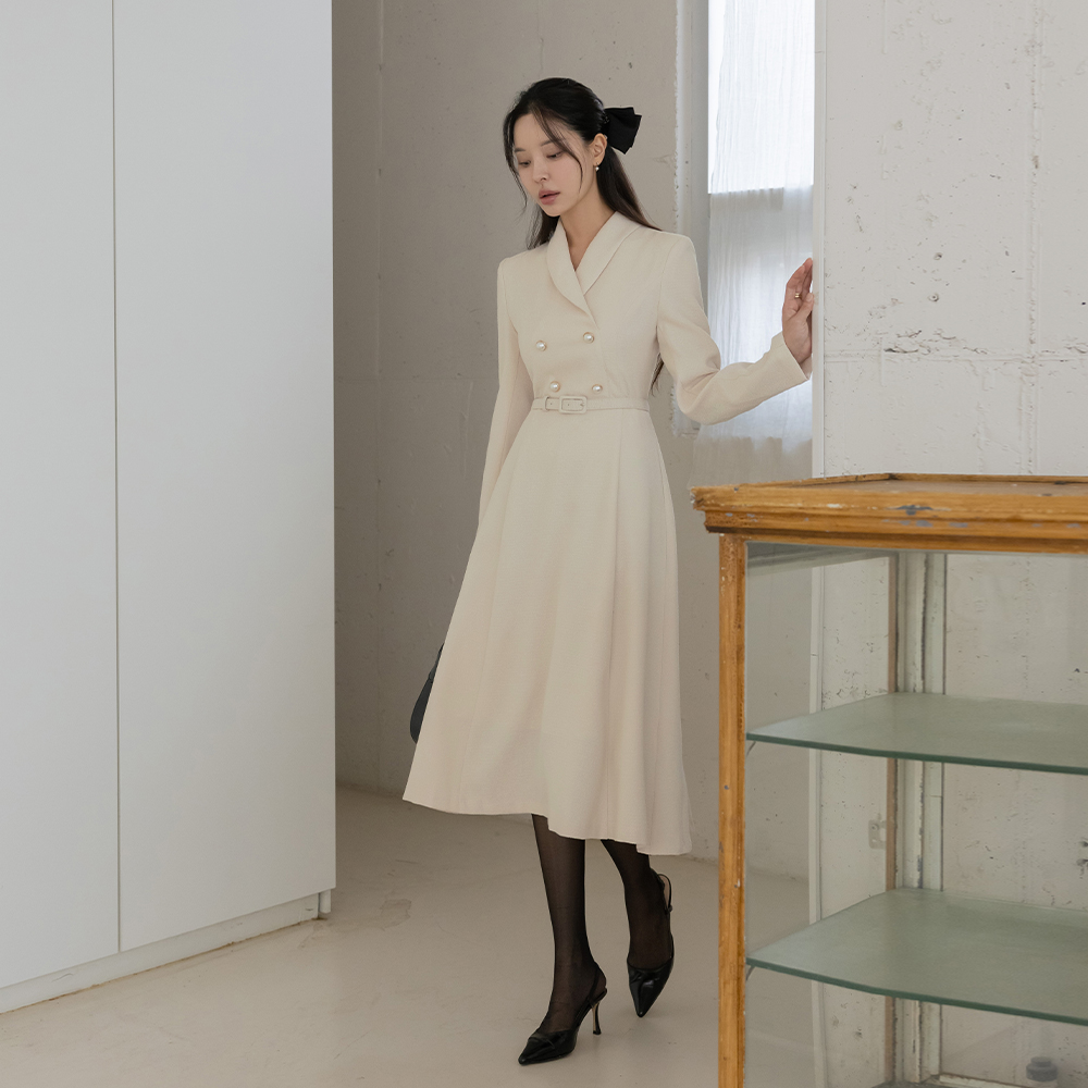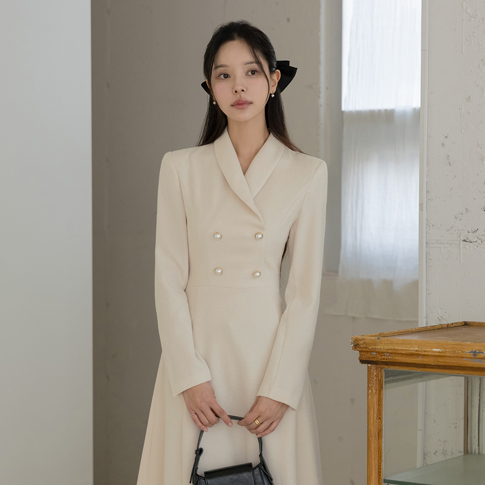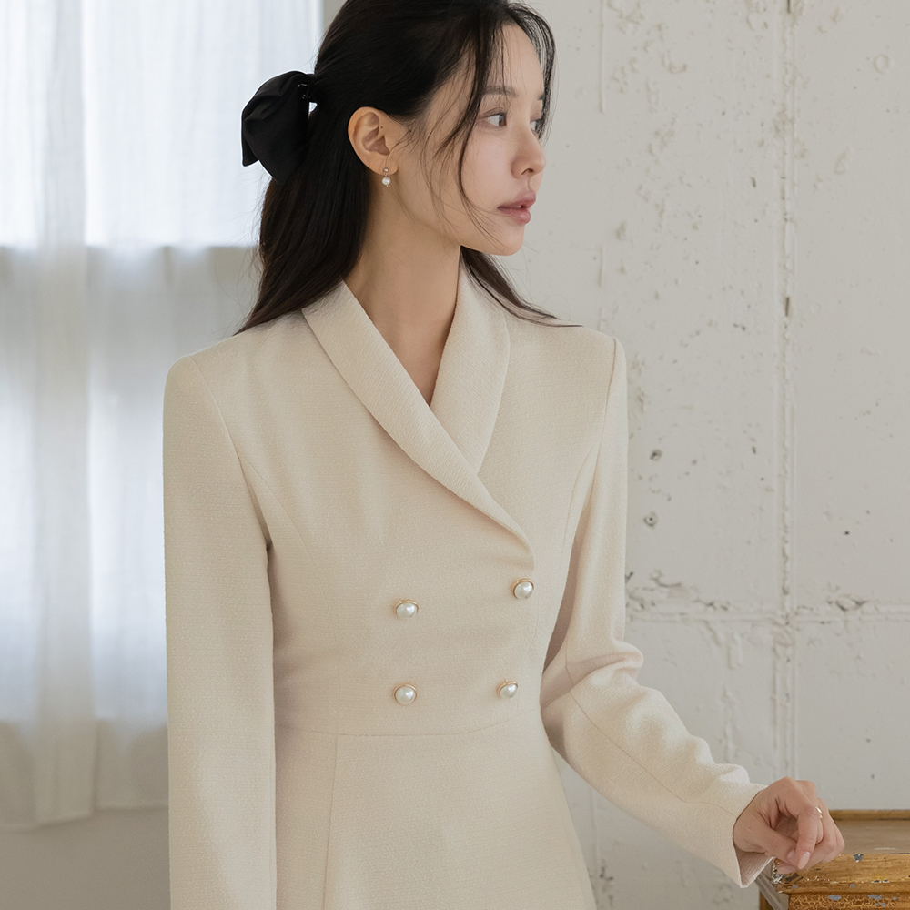 ショールカラー 真珠ボタン Aライン ツイード ワンピース(+ベルト)