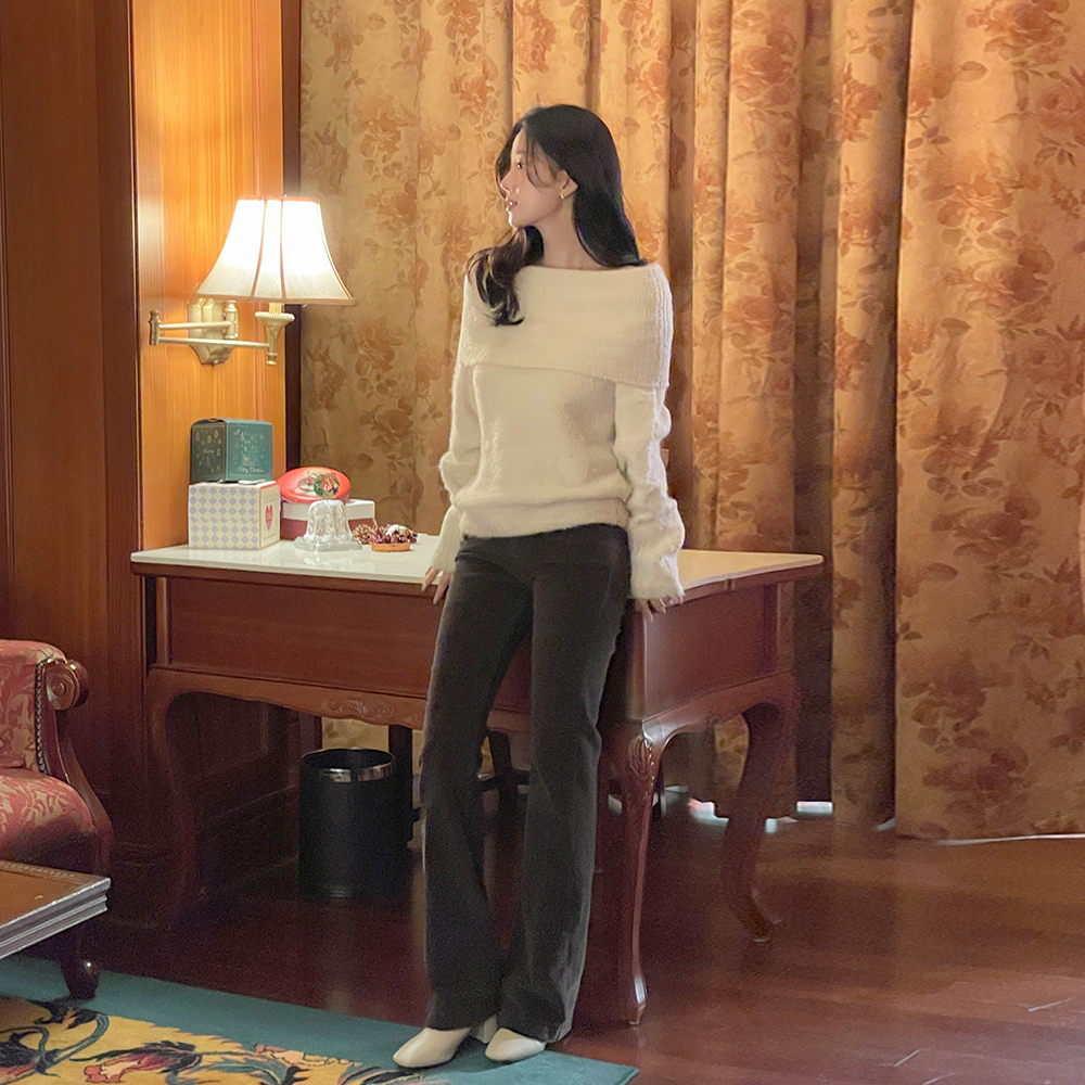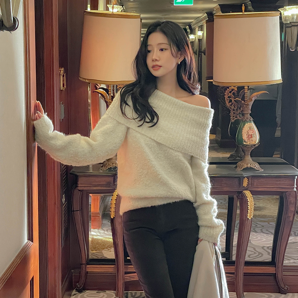 ほっそりした ブークレ ウール 分厚い オフショルダー ニット