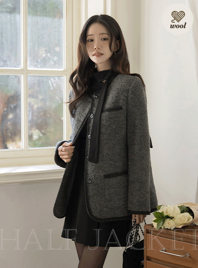ブークレ ラウンドネック キルティング ウール ハーフ ジャケット