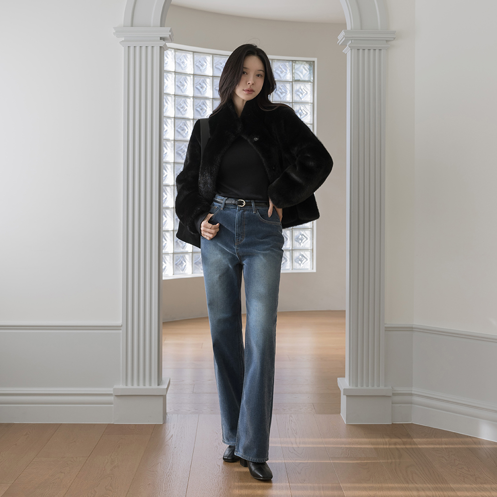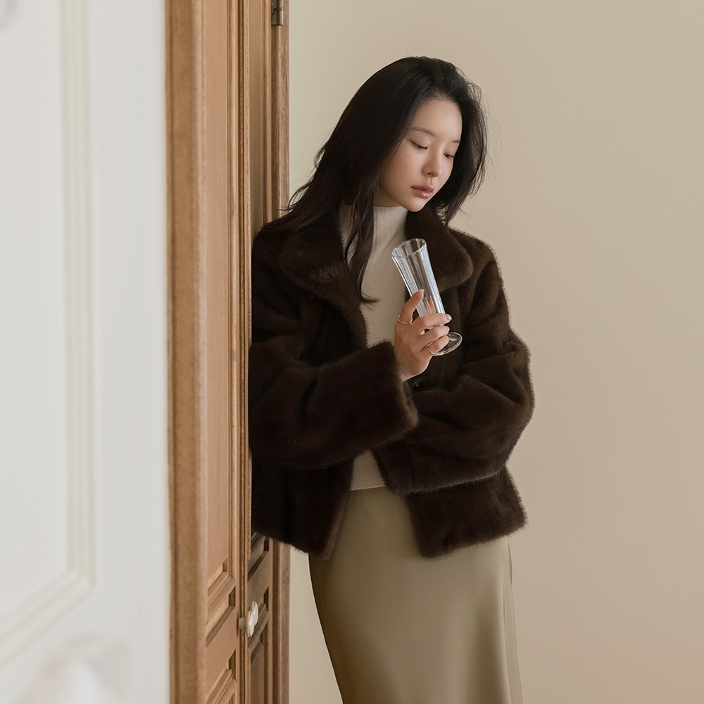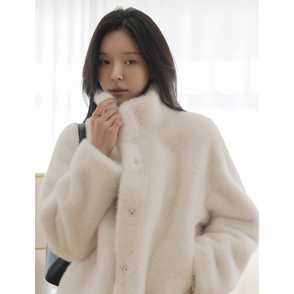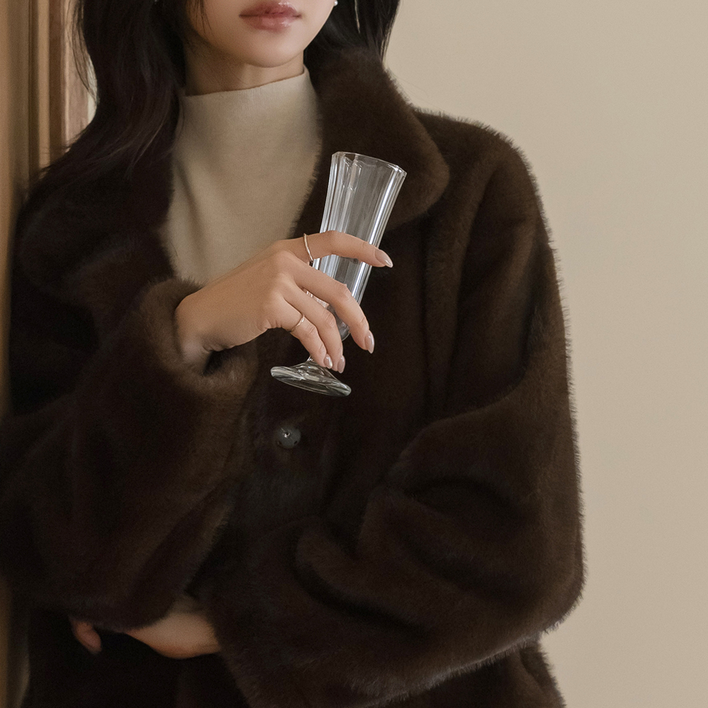 フェミニン シルエット ハイネック シルキー フェイクファー ジャケット