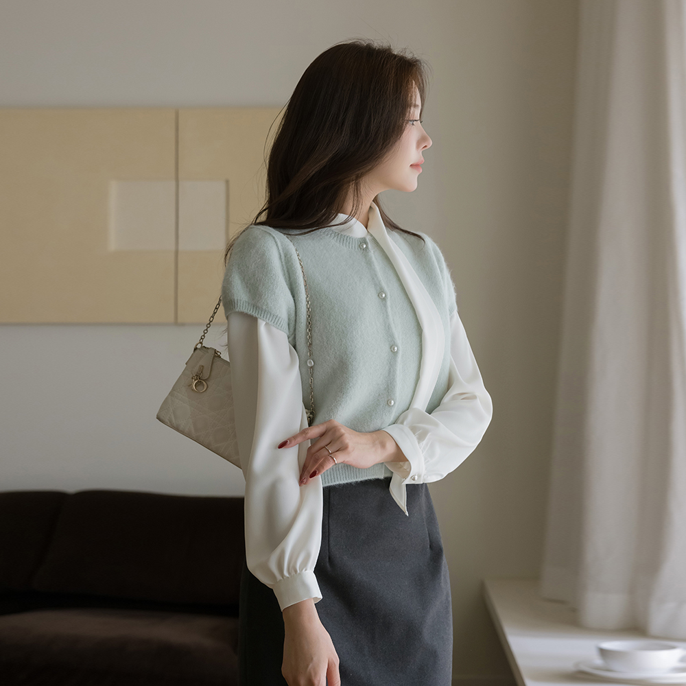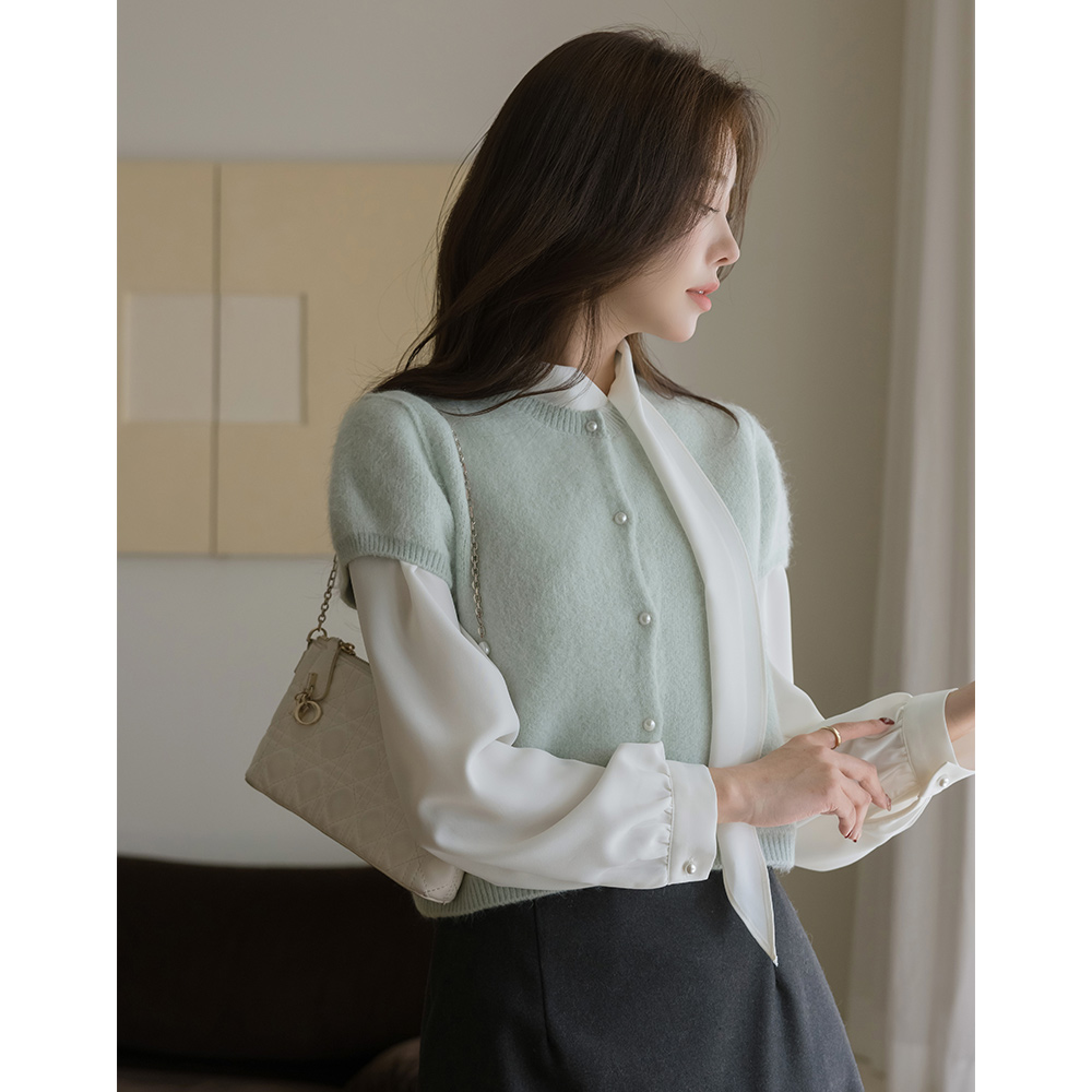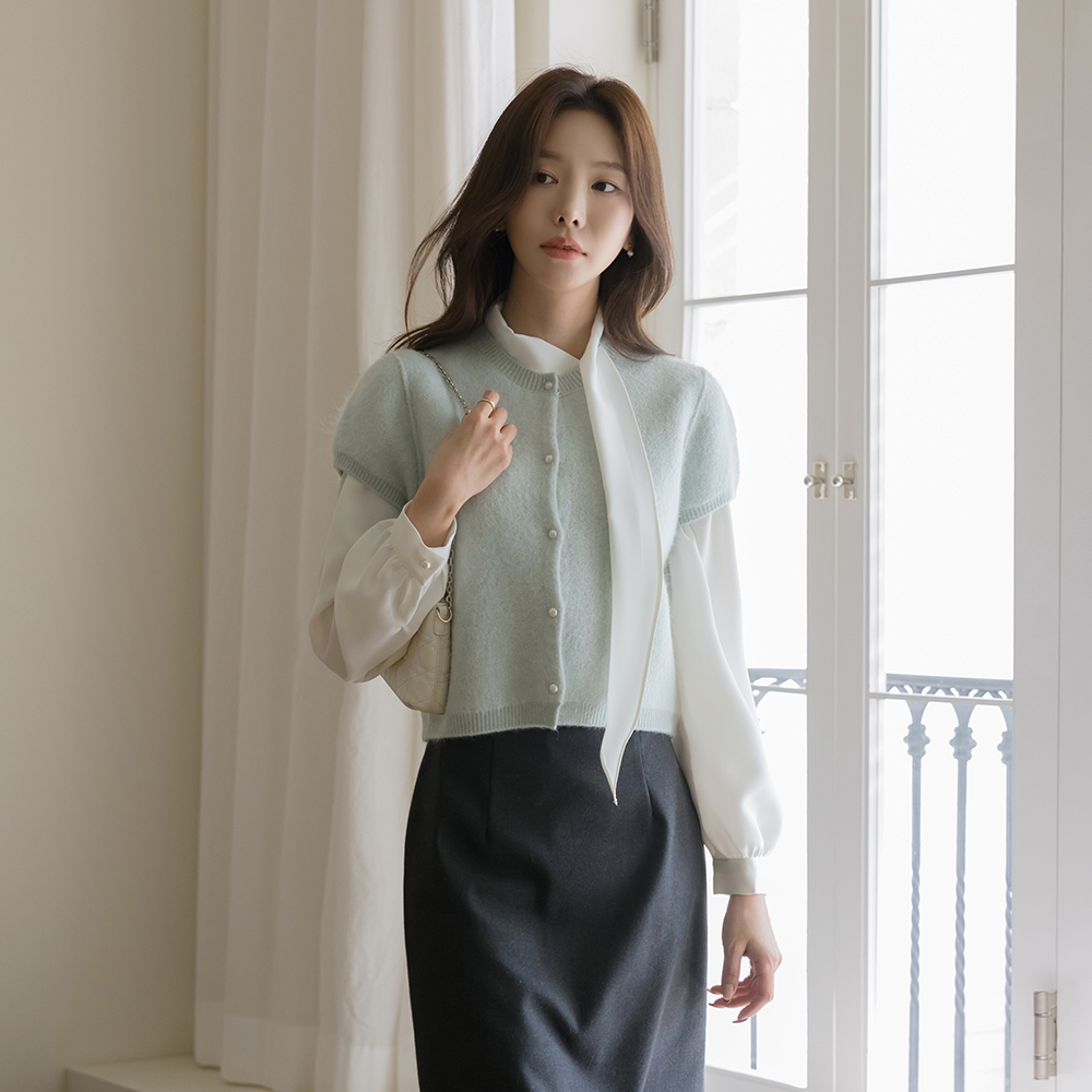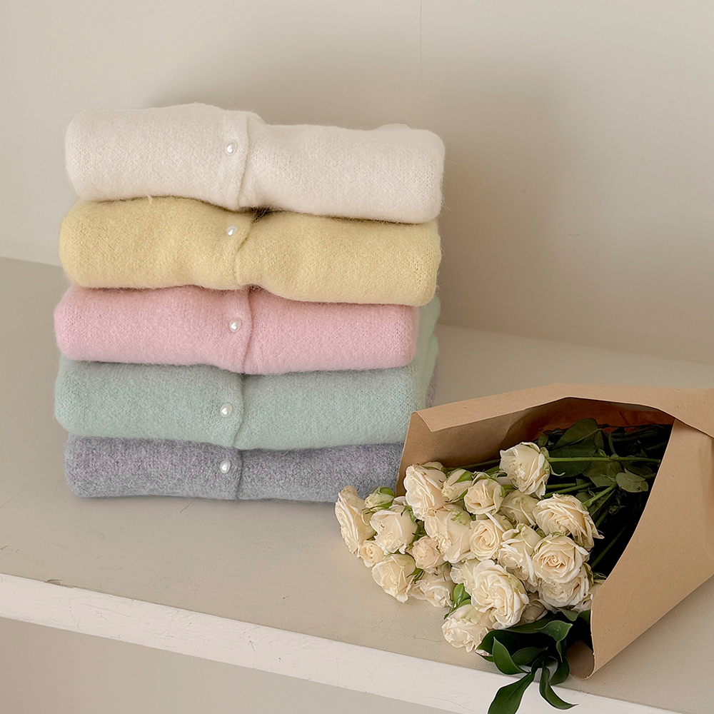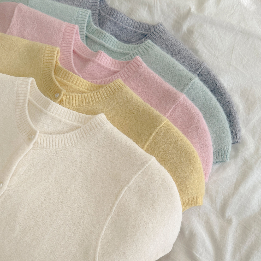 パステル ラウンドネック 真珠 半そで ニット カーディガン