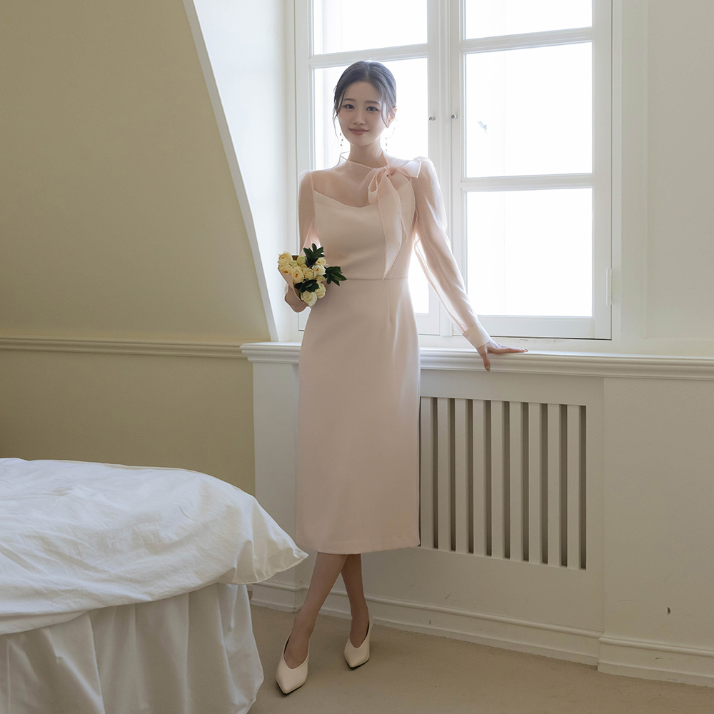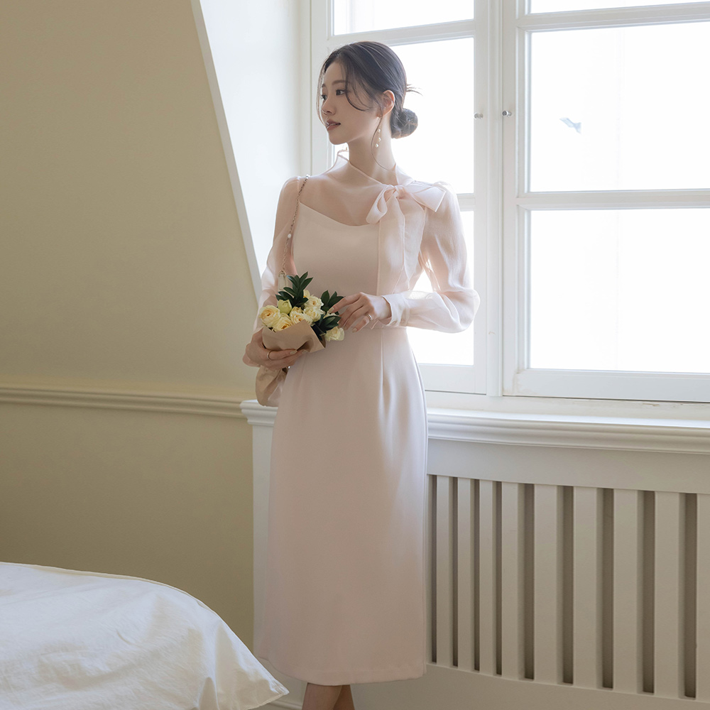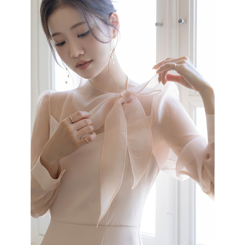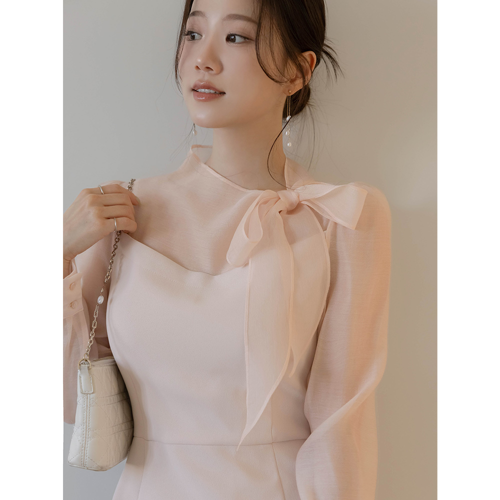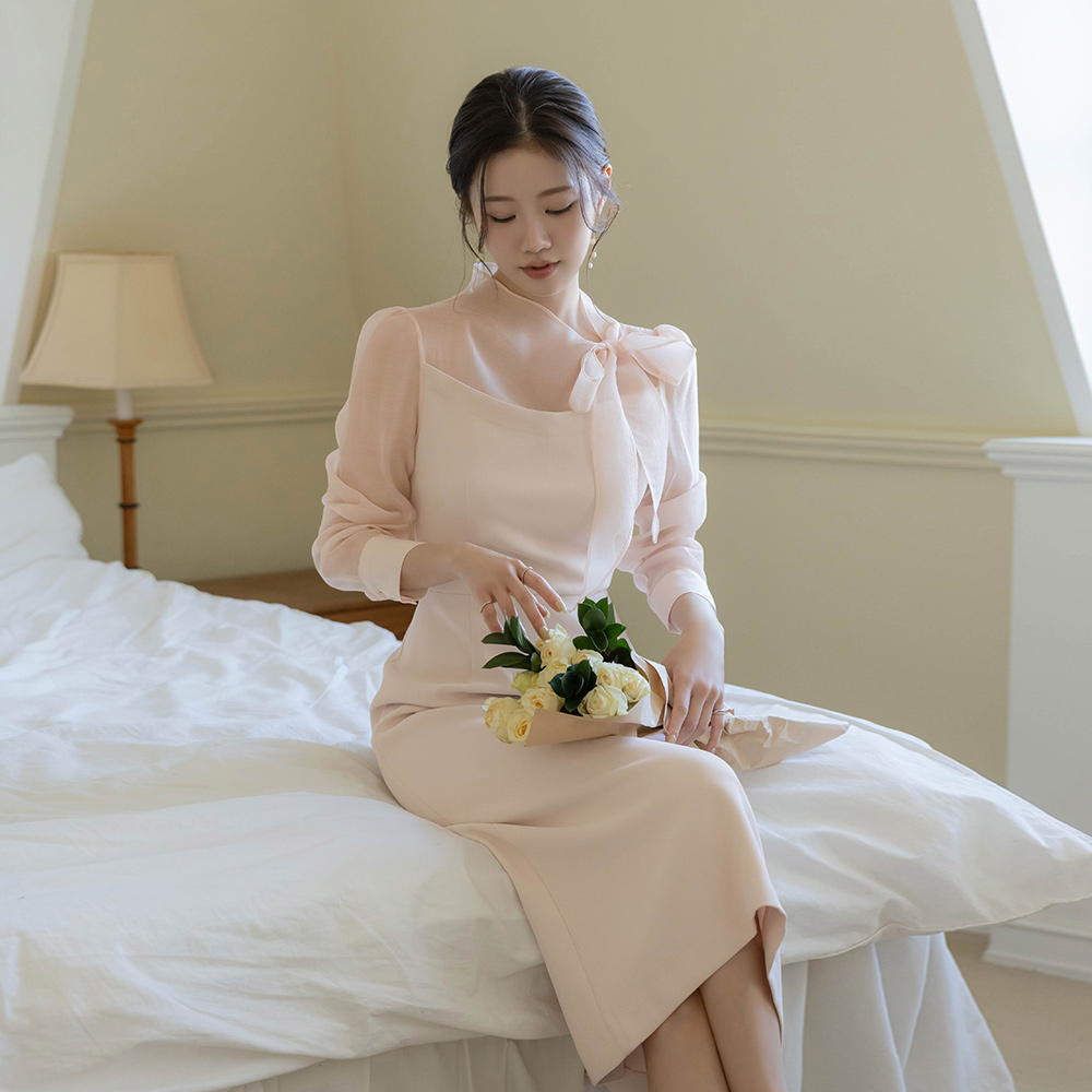 ロマンチック リボン·ネックライン シースルー 配色 Hライン ワンピース