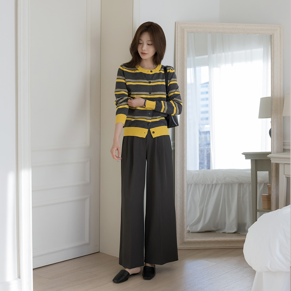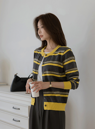 ラウンドネック ストライプ 配色 ニット カーディガン