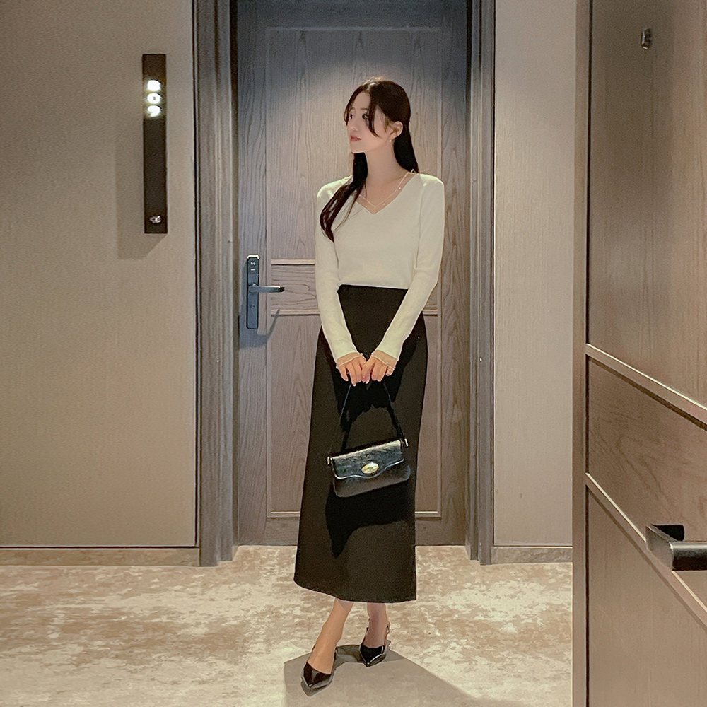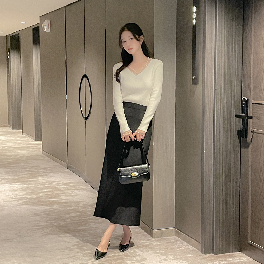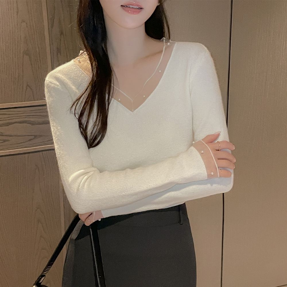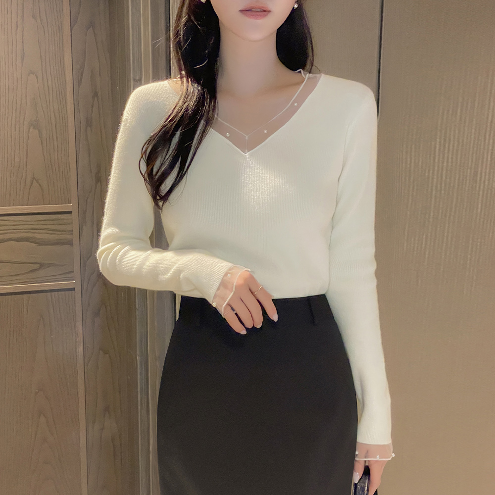 Vネック チュール 真珠 配色 ニット