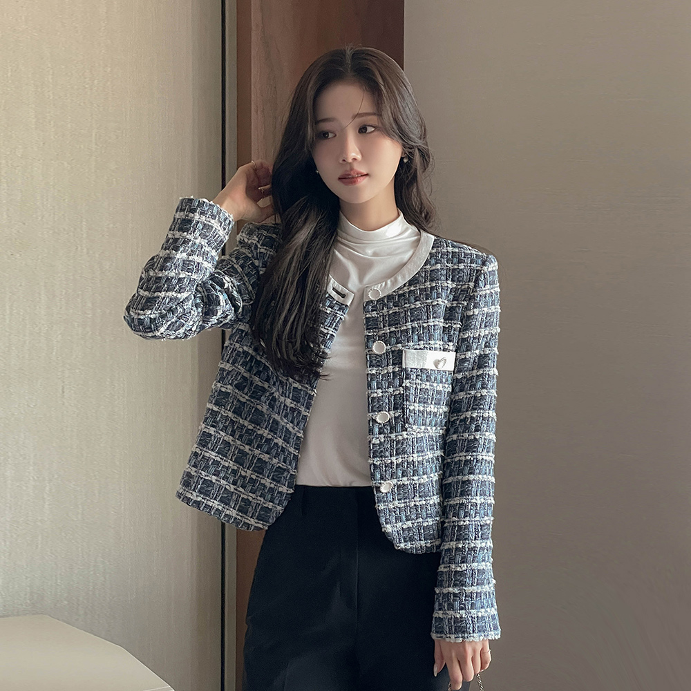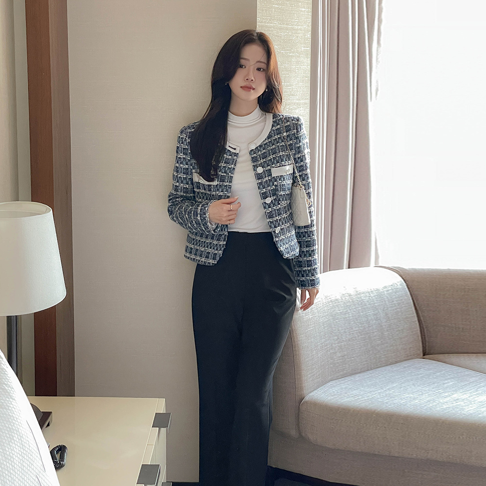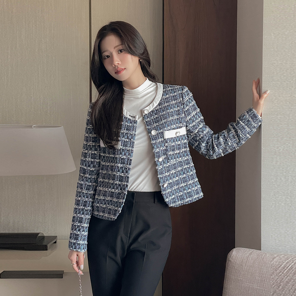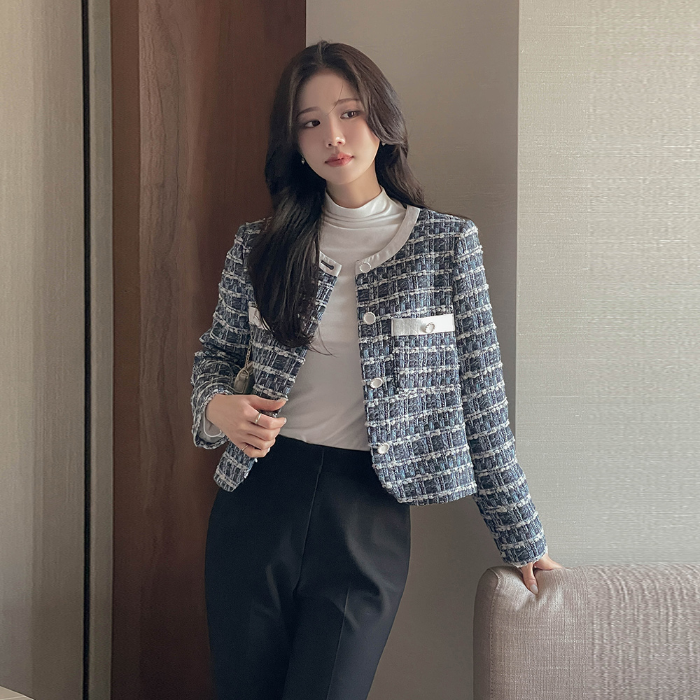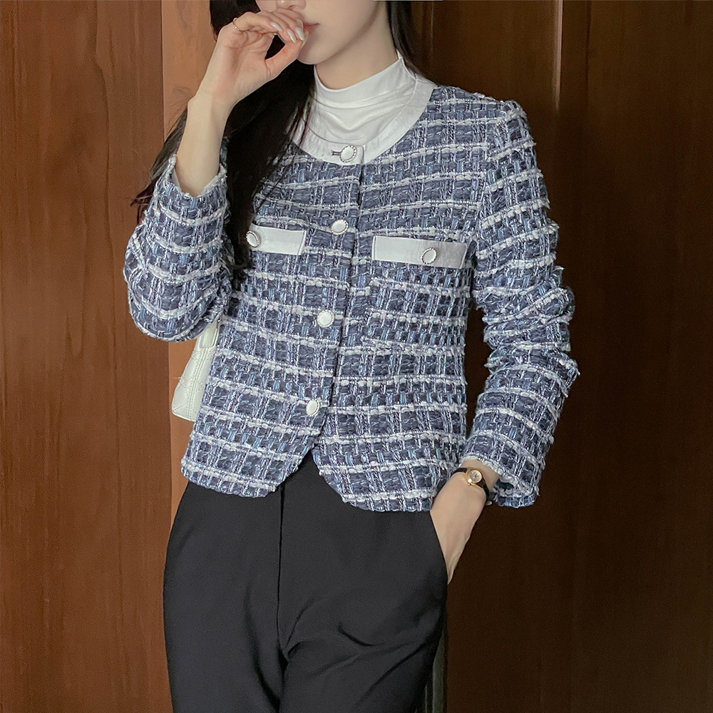 ラウンドネック ウール 配色 ツイード ジャケット