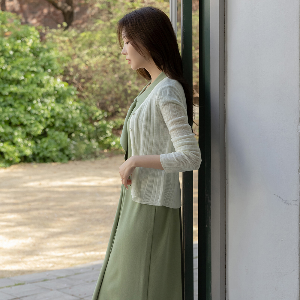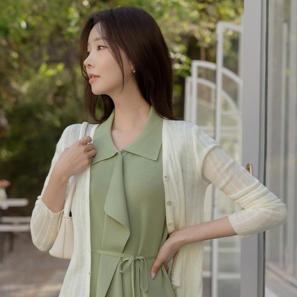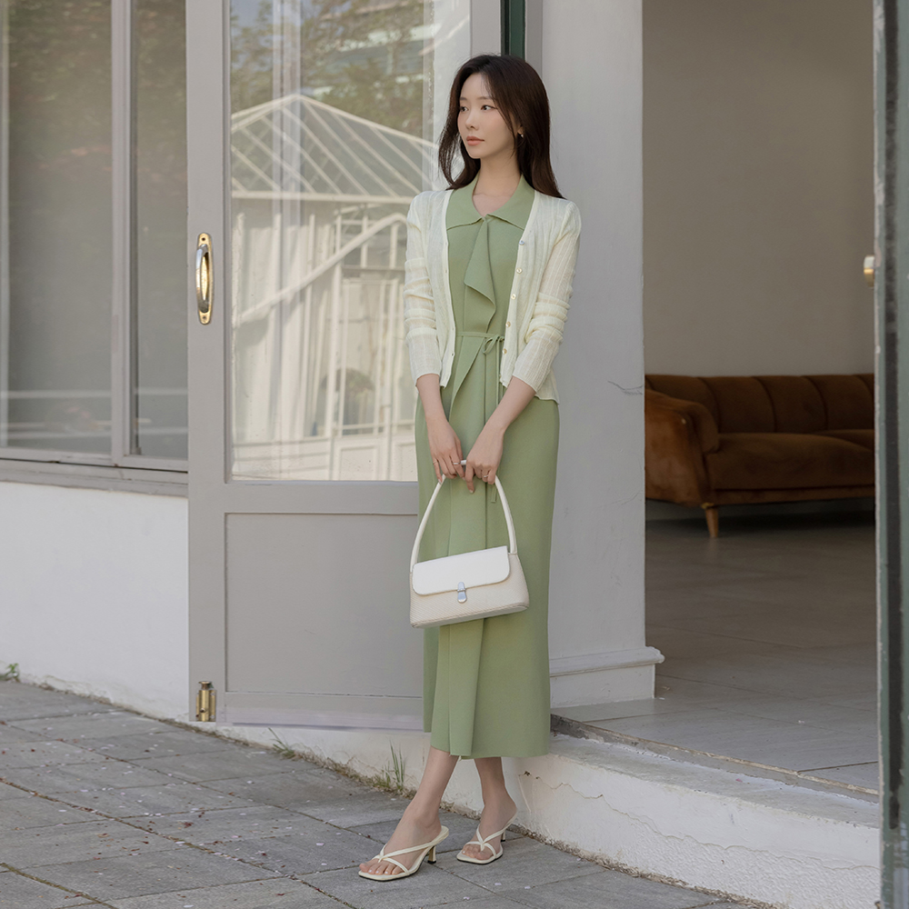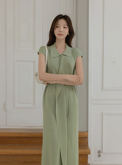 カラーネック ボタン ニット 袖なし ロング ワンピース(+ベルト)